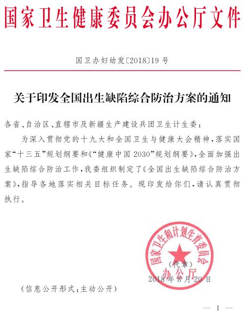 预防和减少出生缺陷,把好人生健康第一关,是提高出生人口素质、推进健康中国建设的重要举措,是坚持以人为本、促进经济社会可持续发展的内在要求。为深入贯彻党的十九大和全国卫生与健康大会精神,落实国家“十三五”规划纲要和《“健康中国2030”规划纲要》,全面加强出生缺陷综合防治工作,制定本方案。